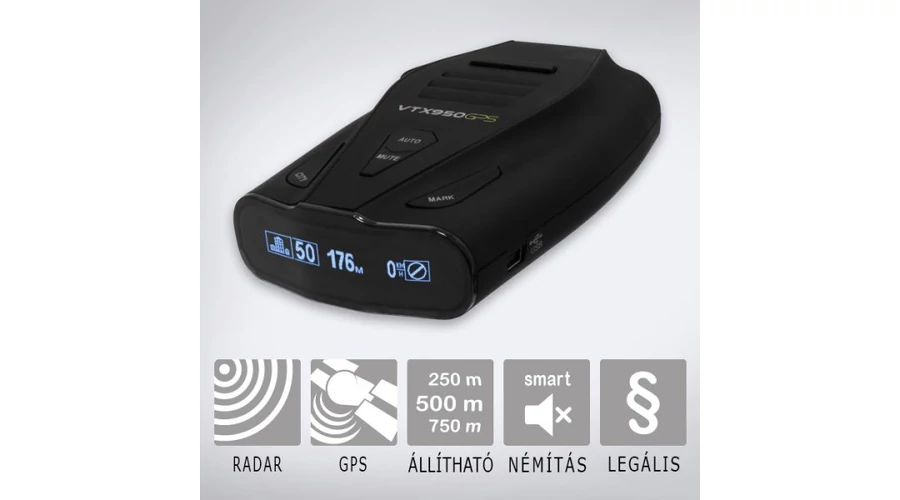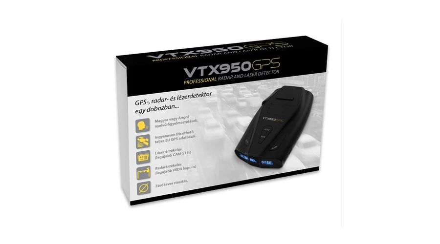 KIYO VTX950 RADAR ÉS LÉZERDETEKTOR GPS ADATBÁZISSALA KIYO TECHNOLOGY termékcsalád legújabb professzionális radardetektora magyar nyelvű figyelmeztetésekkel, a magyar és az európai traffipaxok ellen. GPS adatbázissal.A KIYO termékcsalád legújabb tagja a VTX950GPS detektor – a népszerű KIYO VTX900GPS utódja -, mely a szélvédőre nagyon egyszerűen felszerelhető. Ez a forradalmian új készülék a GPS technológia és az ingyenesen frissíthető, teljes Európa adatbázis segítségével és magyar nyelvű beszédhanggal figyelmeztet a fixen telepített sebességmérők (VÉDA kapuk), átlagsebességmérő zónák, és egyéb veszélyes útszakaszok helyzetéről.További információk