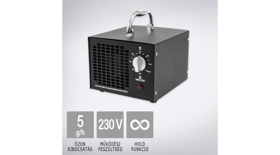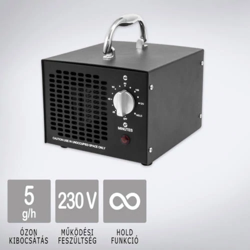 A 150-5G típusú ózongenerátor egy manuális időzítővel és HOLD (végtelenített) funkcióval ellátott, kerámia ózonlapos, 5 g/óra ózonkibocsátással rendelkező készülék, megközelítőleg 90 m2-hez. A készülék hasznos HOLD funkciójával tovább növelhető a kezelendő terület nagysága, vagy hosszabb ideig kezelheti az adott területet.