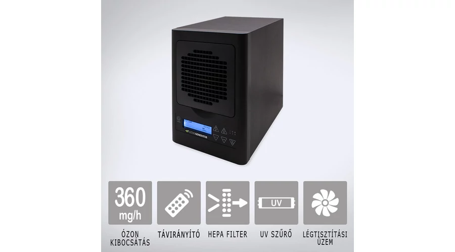Ózongenerátor Home 360 léghigiéniai készülék és Ózongenerátor 3 év garanciávalOtthoni, folyamatos üzemű légtisztító és ózongenerátor. HEPA, karbon és UV szűrővel, 360 mg/óra időszakos ózonkibocsátással. Ajánlott szobák, lakások teljes légtisztítására és időszakos szagtalanítására és fertőtlenítésére.