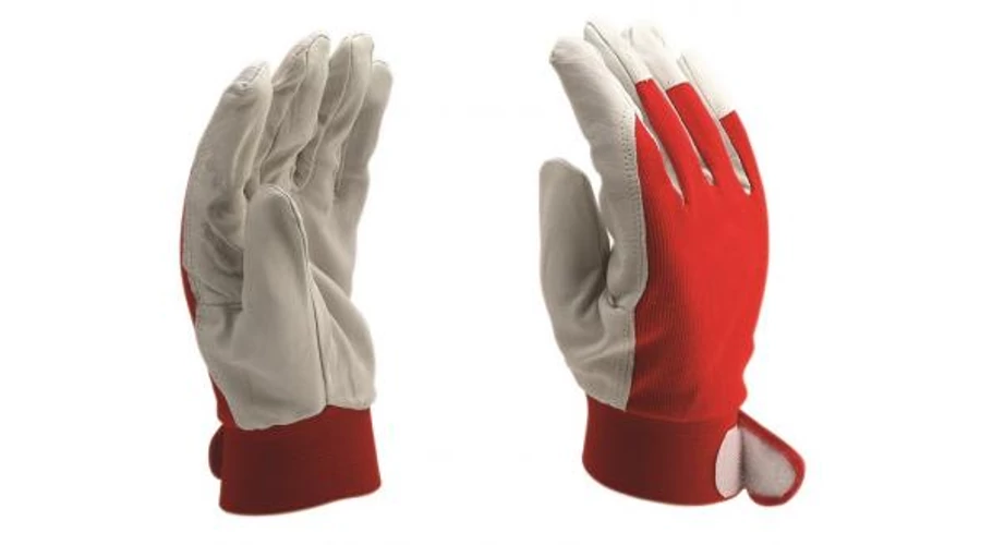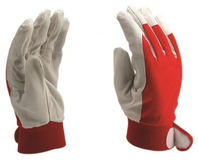 Tört fehér kecske színbőr tenyér. Köröm- és érvédő. Piros pamut kézhát. Tépőzáras csuklórész. Méret: 8, 9, 10, 11, 12, Minősítés: CE, EN388, 2112, |